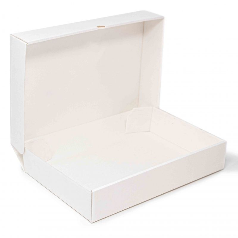 The boxes mod. JEFF 18x27x7 cm anonymous are perfect for pastry thanks to their rectangular shape and box opening. Made of microwave cardboard, they are suitable for food use and ideal for containing cakes, biscuits, sweets and pies. They are also suitable for shipping. Also available with elliptical, rectangular or Sicily-shapedplastic-coated upper window for viewing the contents.