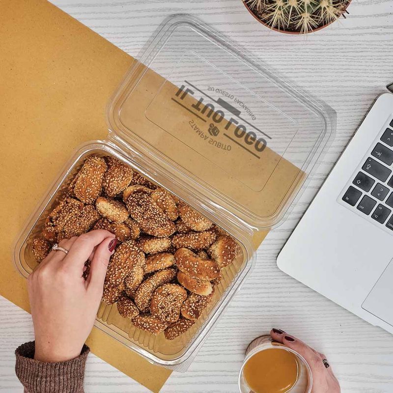 Envase rectangular 2000 ml en PET 174x225x88 mm, ideal para alimentos fríos. Personalizable en la tapa en 1 color.