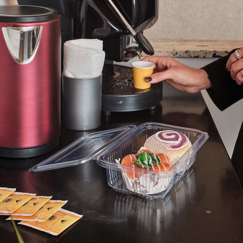 Envase rectangular de 750 ml en PET 125x195x53 mm, ideal para alimentos fríos. Personalizable en tapa de 1 color